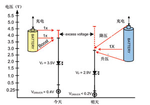 未來,新型鋰離子電池和LED技術(shù)將會為LED驅(qū)動帶來新的挑戰(zhàn)。配合最新的化學成果,電池電壓的范圍將擴大到2.3~4.7V,而典型的白光LED正向電壓將會下降至2.9V。與此同時,輸出驅(qū)動器的飽和電壓都會隨著下降。當采用并聯(lián)驅(qū)動時,要高效地驅(qū)動一個2.9V的LED,就需要動用一個升降壓轉(zhuǎn)換器。圖2所示為由電池、驅(qū)動器和LED技術(shù)的進步所帶來的效果。