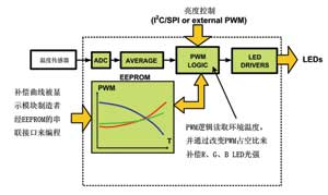 使用RGB背光時,當LED溫度改變時,驅(qū)動器必須更正紅、綠和藍三主色間的亮度平衡,以防出現(xiàn)白點位移。此外,還需保證驅(qū)動器在任何操作溫度下維持光的正確強度。而在補償方面,可以用閉環(huán)或開環(huán)形式。若使用閉環(huán)補償,便需采用感光器來測量白點和其強度。相反地,如使用開環(huán)補償,那溫度便需事先量度出來,并通過預先定義好的補償曲線來調(diào)節(jié)亮度的平衡。