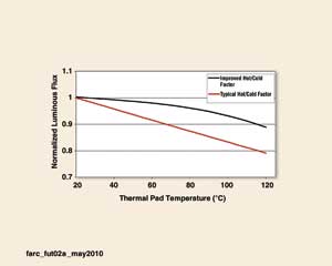 目前,市場(chǎng)上的一些高功率LED的熱/冷因數(shù)為0.94。這意味著LED在100℃條件下工作時(shí),將失去6%的標(biāo)準(zhǔn)光通。圖2給出了典型和改進(jìn)的熱/冷因數(shù)下的光輸出降低函數(shù)。