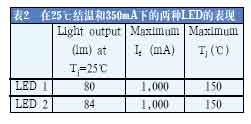 在數(shù)據(jù)表描述的25℃結(jié)溫和350mA的前向電流下,LED2的性能比LED1要好。但是,更實(shí)際的比較將在更高的結(jié)溫下進(jìn)行(見(jiàn)表3)。