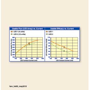 由于LED1的高熱/冷因數(shù),9個(gè)LED1的總光輸出比10個(gè)LED2高出50lm。盡管在25℃時(shí),LED1的額定光通低于LED2,但在350mA的電流驅(qū)動(dòng)下,其性能要超過(guò)LED2。圖3(左)顯示了LED1在任何前向電流的驅(qū)動(dòng)下,都比LED2高出100mA。圖3(右)顯示了在同樣的電流驅(qū)動(dòng)下,LED1的效能要高過(guò)LED2。