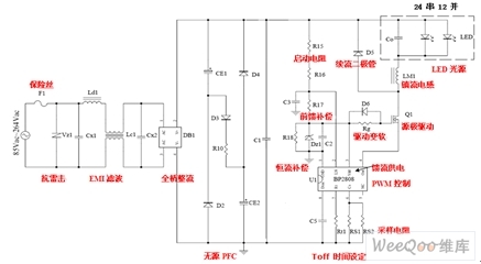 以AC176V—264V全電壓輸入為例,采用BP2808為主芯片來設(shè)計(jì)負(fù)載為小功率多顆LED光源多串、多并的LED日光燈時,整個系統(tǒng)方案的設(shè)計(jì)方框圖如圖1所示。全電路由抗浪涌/雷擊保護(hù)、EMI濾波、全橋整流、無源功率因素校正(PPFC)、啟動電壓(包括前饋補(bǔ)償、開機(jī)后的饋流供電、驅(qū)動變軟)、恒流補(bǔ)償、PWM控制、源極驅(qū)動、LED光源陣列,以及采樣電阻、Toff時間設(shè)定、儲能電感、續(xù)流二極管等各部分組成。
