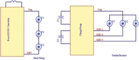 就這點(diǎn)而言,我們可以考慮采用串聯(lián)或并聯(lián)方式對(duì)LED進(jìn)行連接:這兩種連接方式各有其優(yōu)缺點(diǎn),見圖2。