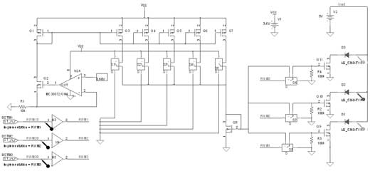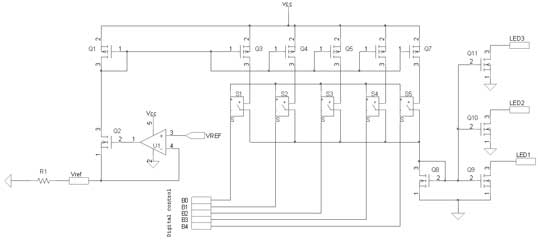 為了在LED中實(shí)現(xiàn)精確及穩(wěn)定的正向偏置條件,通過(guò)與帶隙參考提供的恒定電壓相關(guān)的外部電阻產(chǎn)生一個(gè)參考電流。與運(yùn)算放大器U1相關(guān)的晶體管Q1在Vref引腳產(chǎn)生恒定輸出電壓。Vref和地之間連接的外部電阻產(chǎn)生流經(jīng)Q1和Q2的恒定電流。這個(gè)電流這時(shí)候就被Q3~Q7的晶體管系列建立鏡像和放大,每個(gè)電流被連接至開關(guān)S1~S5,并且被晶體管Q8相加。最后,晶體管Q9復(fù)制參考電流至LED1。這種結(jié)構(gòu)針對(duì)每個(gè)LED進(jìn)行復(fù)制,而芯片的布局經(jīng)仔細(xì)分析,以優(yōu)化每個(gè)LED之間的匹配。