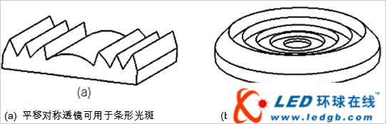 將設計好的截面旋轉或拉伸,就可以得到三維的透鏡。圖5為兩個菲涅爾透鏡的實例。拉伸得到的(a)可用于條形光斑,旋轉得到的(b)可用于圓形光斑。