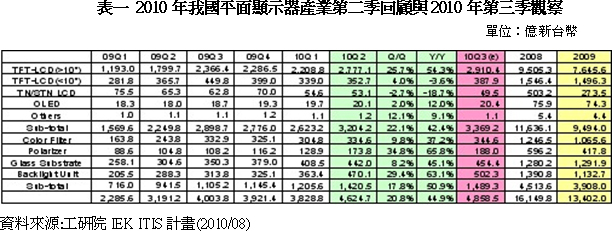 2010年第二季臺灣平面顯示器總產值達新臺幣4,624.7億元,比前一季成長20.8%。其中面板產業(yè)產值新臺幣3,204.2億元,比前一季成長22.1%,主力為大型TFT LCD面板產業(yè),產值約新臺幣2,777.1億元;其次為中小型TFT LCD面板產業(yè),產值約新臺幣352.7億元;TN/STN面板產業(yè),產值約新臺幣53.1億元,而OLED產業(yè)產值則為新臺幣20.1億元。關鍵零組件產業(yè)產約為新臺幣1,420.5億元,比前一季成長17.8%,其中彩色濾光片產業(yè)產值約新臺幣334.6億元,偏光板產業(yè)產值約新臺幣173.8億元,玻璃基板產業(yè)產值約新臺幣442億元,背光模組產業(yè)產值約新臺幣470.1億元。