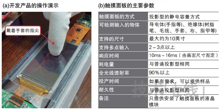 除了可以用絕緣物輸入的特點(diǎn)以外,在具有10ms~16ms的響應(yīng)時(shí)間、90%以上的全光線透射率以及耗電量和耐久性等方面,此次開發(fā)的產(chǎn)品與普通的投影型性能相同。在檢測(cè)控制方面,可使用原來用于投影型的控制器IC。