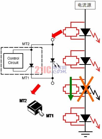 增強(qiáng)LED串可靠性的保護(hù)方案如前所述,區(qū)域照明應(yīng)用中通常會(huì)采用多串LED。雖然LED本身的可靠性很高,但如果LED串中的某個(gè)LED發(fā)生開(kāi)路故障,那么整串LED就可能關(guān)閉,而街道照明等應(yīng)用中就要避免這種狀況,從而降低后期維護(hù)成本。有鑒于此,安森美半導(dǎo)體推出了NUD4700 LED電流旁路保護(hù)器(見(jiàn)圖3)。這器件是一款分流器件,萬(wàn)一LED串中某個(gè)LED開(kāi)路,則會(huì)提供電流旁路,確保在某個(gè)LED故障的條件下整串LED不會(huì)關(guān)閉;而且恰當(dāng)處理散熱的話(huà),還可支持大于1 A的大電流。