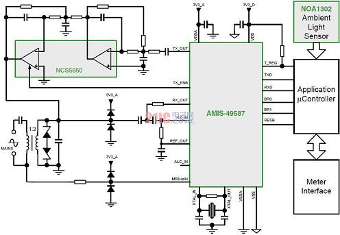 有利的是,設(shè)計(jì)人員采用安森美半導(dǎo)體的AMIS-49587電力線(xiàn)載波(PLC)調(diào)制解調(diào)器、PLC線(xiàn)路驅(qū)動(dòng)器NCS5650和諸如NOA1302這樣的環(huán)境光傳感器,基于電力線(xiàn)輕易地構(gòu)建聯(lián)網(wǎng)型LED街燈智能控制系統(tǒng)(參見(jiàn)圖4)。其中,安森美半導(dǎo)體的環(huán)境光傳感器包含的輸出類(lèi)型,如NOA1302和NOA1305提供的是數(shù)字輸出,而NOA1211為模擬輸出。這些光傳感器的工作電流極低,在100流明光輸出條件下分別僅為58 μA、550 μA和115 μA,因而對(duì)系統(tǒng)能效的影響極小。