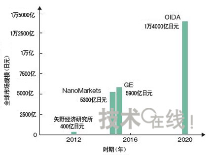 [page]圖有機(jī)EL照明/光源市場到2020年將占到照明市場整體的2成圖為針對包括普通照明、特殊照明及背照燈等在內(nèi)的有機(jī)EL照明今后的市場規(guī)模,日本矢野經(jīng)濟(jì)研究所、NanoMarkets、GE及OIDA發(fā)布的預(yù)測及目標(biāo)。市場規(guī)模方面,預(yù)計2015年全球?qū)⑦_(dá)到5000多億日元,到2020年將大大超過1萬億日元。