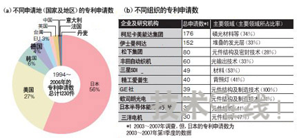 圖日本廠商在開發(fā)方面領(lǐng)先圖為Cintelliq公司就以實現(xiàn)有機(jī)EL照明為目的的專利申請數(shù)所做調(diào)查的結(jié)果。按申請地劃分,日本為56%,大大超出排在第2位的美國,遙遙領(lǐng)先(a)。在本圖中,1994~2006年的專利申請數(shù)通過2003年以后的文獻(xiàn)調(diào)查得到。按不同組織劃分,柯尼卡美能達(dá)集團(tuán)為176件,排在第1位(b)。大約3/4的專利與藍(lán)色磷光材料有關(guān)。(b)為2003~2007年有機(jī)EL照明(包括背照燈)專利按組織劃分的申請數(shù)(前10家公司)及主要領(lǐng)域。由于按組織劃分的日本專利申請數(shù)數(shù)據(jù)中不包含2007年第2季度以后的數(shù)據(jù),因此,實際上日本企業(yè)的申請數(shù)有可能更多。