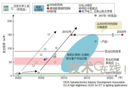 圖效率方面與白色LED僅有“約2年的差距”圖為有機(jī)EL照明發(fā)光效率的變化走勢與白色LED研發(fā)品的對比。2000年前后,實際上白色LED與有機(jī)EL照明的發(fā)光效率幾乎沒有差距。其后的4~5年,在有機(jī)EL照明開發(fā)沒有大的進(jìn)展的情況下,被白色LED遠(yuǎn)遠(yuǎn)落在后面。目前,有機(jī)EL照明的研發(fā)如火如荼,2008年6月實現(xiàn)了高達(dá)102lm/W的發(fā)光效率。其與白色LED的差距,在發(fā)光效率方面縮小到了大約2年。