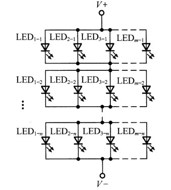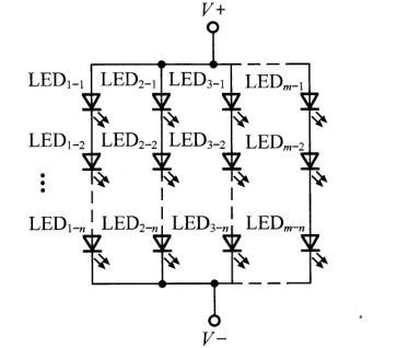 若干個(gè)LED先并后串的混聯(lián)形式如圖6所示。由于LED1-n~LEDm-n先并聯(lián)連接,提高了每組LED故障下的可靠性,但是由此一來(lái)每組并聯(lián)LED的均流問(wèn)題就至關(guān)重要。為此,可以通過(guò)配對(duì)挑選,將工作電壓和電流盡量相同的LED作為并聯(lián)的一組,或者給每個(gè)LED串接小的均流電阻來(lái)解決。這種混聯(lián)形式具有的其他特點(diǎn)和存在的問(wèn)題,與先串后并連接形式相類(lèi)似。