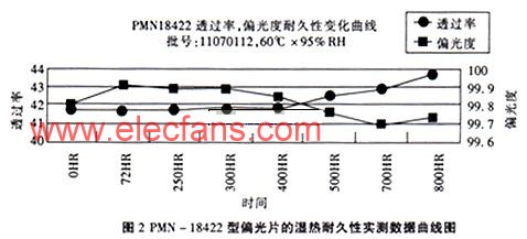 耐濕熱技術(shù)指標(biāo)是指偏光片在恒溫恒濕條件下的耐濕熱工作性能,它也通常分為三個技術(shù)等級,既通用型:濕熱工作條件為40℃×90%RH×500HR;中耐久型:濕熱工作條件為60℃×90%RH×500HR;高耐久型:濕熱工作條件為:70℃×95%RH×500HR以上。由于構(gòu)成偏光膜的基本材料PVA膜和碘及碘化物都是極易水解的材料,同時也由于偏光片所使用的壓敏膠在高溫高濕條件下也容易劣化,因此,在偏光片的耐久性技術(shù)指標(biāo)中最重要的就是耐高溫和耐濕熱指標(biāo),如果耐高溫和耐濕熱指標(biāo)通過,其它耐久性型指標(biāo)通常都不會發(fā)生問題。“福地”牌通用型PLN產(chǎn)品和中耐久PMN產(chǎn)品都能夠很好地滿足各自相應(yīng)技術(shù)等級所規(guī)定的耐久性技術(shù)指標(biāo)的要求(見圖2)。