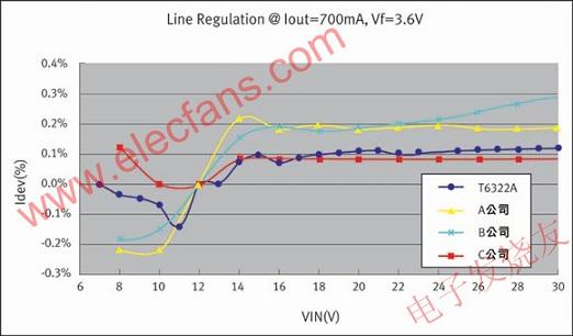 圖1對T6322與其它產(chǎn)品的功率轉(zhuǎn)換效率進行了對比。圖2是T6322與其他產(chǎn)品的線路調(diào)整能力的對比(低電流變動率即表示高線路調(diào)整能力)。