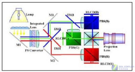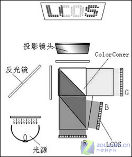 投影機(jī)技術(shù)基本顯影原理相仿,主要是由鹵素?zé)?、氙氣燈等發(fā)光,集光至面板,將面板的影像經(jīng)反射或透射投射出影像,再經(jīng)過分光、合光系統(tǒng),最后將影像投射到屏幕顯像。LCOS(LiquidCrystalonSilicon)是一種全新的數(shù)碼成像技術(shù),它采用半導(dǎo)體CMOS集成電路芯片作為反射式LCD的基片,CMOS芯片上涂有薄薄的一層液晶硅,控制電路置于顯示裝置的后面,可以提高透光率,從而實(shí)現(xiàn)更大的光輸出和更高的分辨率。