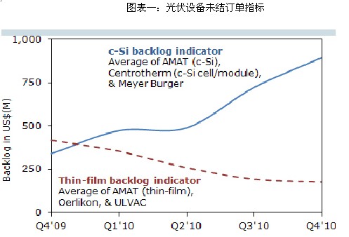隨著2011年所公布的超越60%年度增長率的產(chǎn)能的擴(kuò)張,首選設(shè)備供應(yīng)商的訂單使得未結(jié)訂單總量創(chuàng)下新記錄,超過了2008年由高價格交鑰匙薄膜生產(chǎn)線業(yè)務(wù)推動的水平。2010年第四季度末,有20家設(shè)備供應(yīng)商的訂單積累已經(jīng)超過了1億美金,這些訂單主要的出貨時間集中在2011年上半年。目前的未結(jié)訂單總量與2009年第四季度相比有26%的增長,導(dǎo)致2010年的訂單出貨比原高于上一年水平(1.24),其中2010年第二季度的更是創(chuàng)下了1.7的八季高點。