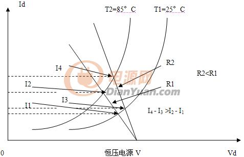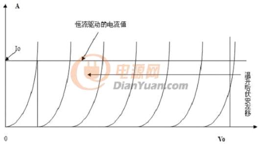溫升以后,N個(gè)伏安特性都左移,就使電流的增加也加大了N倍。如果采用恒流電源供電,那么溫升以后,仍然能夠保持電流恒定為Io。