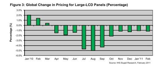 據(jù)IHS iSuppli公司的研究,由于需求疲軟和庫存上升,2月份大型液晶顯示器(LCD)面板價格繼續(xù)下降,但到4月份這種情況可能會有所改善,因?qū)脮r品牌廠商會增加購買電視面板。