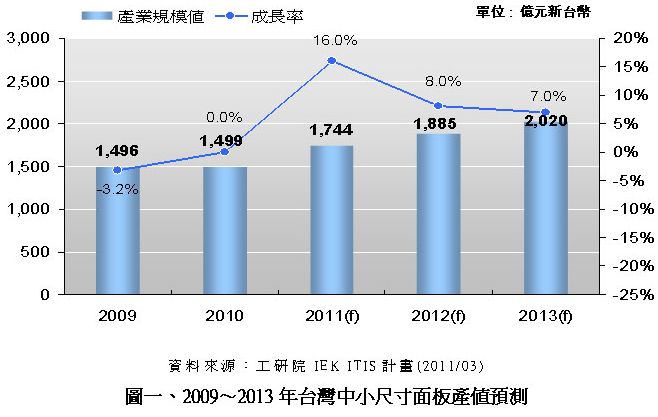 - 2011年臺(tái)灣中小尺寸面板產(chǎn)值將大幅成長(zhǎng)16%