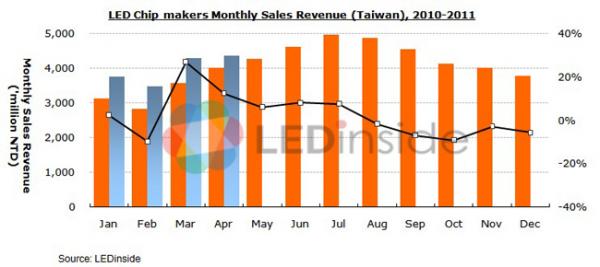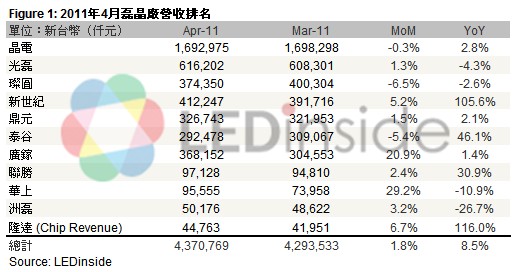 - 011年4月臺灣上市上柜LED廠商營收總額約96.2億元
