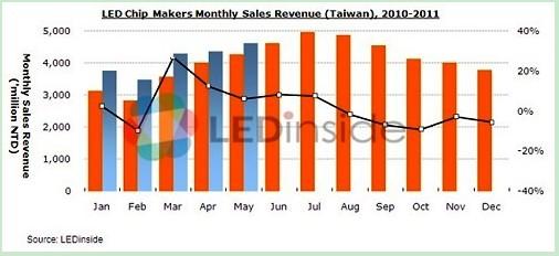 近日消息,據(jù)統(tǒng)計,2011年5月臺灣上市上柜 LED 廠商營收總額約新臺幣99.57億元(月成長5.8%、年成長8.3%)。
