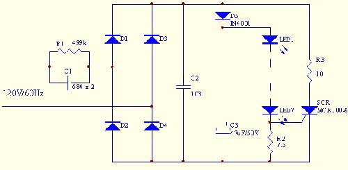 在圖二電路中﹐可控硅SCR及R3組成保護(hù)電路﹐當(dāng)流過LED的電流大于設(shè)定值時(shí)﹐SCR導(dǎo)通一定的角度﹐從而對(duì)電路電流進(jìn)行分流﹐使LED工作于恒流狀態(tài)﹐從而避免LED因瞬間高壓而損壞。