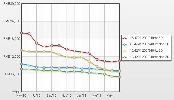 觀察2011年6月大陸3D TV相對(duì)2010年12月均價(jià)跌幅,以40/42寸、46/47寸、52/55寸3D TV跌幅大于全球,主因上述尺寸價(jià)格競(jìng)爭(zhēng)較為激烈。