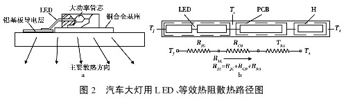 本文研究的汽車前大燈用LED是目前OSRAM公司最大功率的一種LEUMD1W4;管芯散熱設(shè)計(jì)選用了一種更利于散熱的LE3S封裝。這種封裝的特點(diǎn)是,以面積較大的銅合金散熱墊為基座,管芯固定在基座中央。同時(shí)將LED基座與鋁基板接觸區(qū)域的絕緣介質(zhì)剝離,使銅合金基座與鋁基板直接接觸。基座上的熱直接傳導(dǎo)至LED的外部。這種內(nèi)部結(jié)構(gòu)去處了管芯和基座之間的介質(zhì)減少了熱阻,更直接地將管芯的結(jié)溫導(dǎo)出(見圖2a)。
