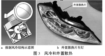 (2)強(qiáng)制對(duì)流提供與外界空氣熱交換。在散熱片的背面加裝風(fēng)扇促使強(qiáng)制空氣流動(dòng)。風(fēng)扇加速了散熱片的熱交換的同時(shí),流動(dòng)的空氣也直接從PCB板上帶走了部分熱量。由于燈體的狹小且密封,與外界的空氣對(duì)流幾乎不可能。圖3a所示風(fēng)冷結(jié)構(gòu)中風(fēng)扇的強(qiáng)制對(duì)流可以緩解散熱器中心區(qū)域與周圍環(huán)境的溫度不均勻,使燈體內(nèi)部和燈體外殼的溫度盡量接近。有助于將內(nèi)部的熱通過(guò)外殼和外置散熱器傳導(dǎo)出去。