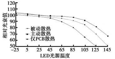 圖4是LED光源溫度與光衰在不同的散熱方式下的關(guān)系曲線。圖中可見僅PCB散熱、加散熱器的被動(dòng)散熱和強(qiáng)制對(duì)流的主動(dòng)散熱3種不同散熱設(shè)計(jì)存在相當(dāng)大的差異。后二種在105℃時(shí),基本上能夠提供80%以上的出光率。