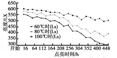 我們對(duì)圖3b所示的前大燈樣件做了不同條件下的光衰測(cè)試,試驗(yàn)建立在LED散熱良好的基礎(chǔ)上,模組安裝在大燈封閉殼體內(nèi),溫度檢測(cè)點(diǎn)在LED光源附近。試驗(yàn)數(shù)據(jù)采集時(shí)的環(huán)境溫度是在燈體外部施加的。試驗(yàn)結(jié)果表明環(huán)境溫度60℃時(shí),光衰緩慢;100℃時(shí),光衰加劇(見圖6)。