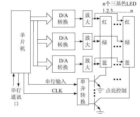 設(shè)計并制作了一套LED 調(diào)光裝置,采用單片機(jī)通過三路D \ A 轉(zhuǎn)換輸出分別控制LED 紅、綠、藍(lán)三基色輸出,實現(xiàn)對半導(dǎo)體照明色彩和亮度寬范圍、高精度的調(diào)節(jié),同時通過串并轉(zhuǎn)換掃描方式使一套系統(tǒng)可對多個LED 分別控制,實現(xiàn)其在高精度控光和控色的基礎(chǔ)上可組成任意的靜、動態(tài)圖案或畫面。