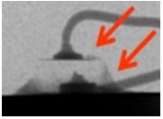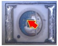 2. 變色:這類(lèi)失效是指LED不點(diǎn)亮的狀況下,外觀顏色或膠材透明度與新品不同,用肉眼即可看出,通常在產(chǎn)品使用一段時(shí)間或在做完可靠度試驗(yàn)后發(fā)生。一般說(shuō)來(lái),變色區(qū)域大致可區(qū)分為發(fā)生在導(dǎo)線(xiàn)架或封裝膠材兩類(lèi),若發(fā)生在導(dǎo)線(xiàn)架,通常是因?yàn)楸砻媾c環(huán)境中的化學(xué)物質(zhì)發(fā)生反應(yīng),如氧化或硫化,要分辨屬于哪種需仰賴(lài)成份分析,可使用的儀器包含有EDS(Energy Dispersive X-ray Spectroscope)、XPS(X-ray Photoelectron Spectrometer)、AES(Augur Electron Spectroscope)等等。若是封裝用的膠材發(fā)生變色,則屬于高分子材料的劣化現(xiàn)象,如環(huán)氧樹(shù)脂易受高溫或是紫外光影響而變黃,因此白光LED多改采矽膠取代之。分析此類(lèi)失效應(yīng)特別留意,因膠材本身有一定的透明度,有時(shí)變色的導(dǎo)線(xiàn)架因被膠材蓋住而誤判為膠材變色,引導(dǎo)至錯(cuò)誤的改善方向。