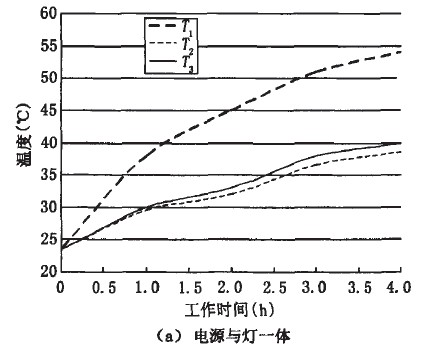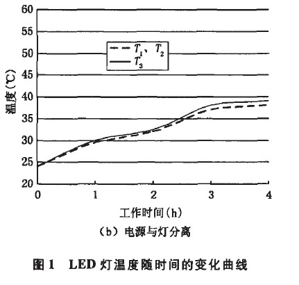 由于電源本身產(chǎn)生一定的熱量,使得LED燈上的熱量來(lái)源增加。同時(shí),電源與燈一體設(shè)計(jì)使得LED燈整體受熱不均,這些因素都會(huì)導(dǎo)致燈具發(fā)生疲勞和早期失效,而影響其壽命。圖1為L(zhǎng)ED燈溫度隨工作時(shí)間的變化曲線(xiàn),圖中T1為放置電源處溫度,T2為遠(yuǎn)離電源處溫度,T3為燈體中心溫度。從圖中看出,隨著工作時(shí)間的增加,圖1(a)中T1遠(yuǎn)大于T2和T3;圖1(b)中T1與T2兩曲線(xiàn)重合,T3略大于T1和T2。可見(jiàn)分離電源后,整燈的溫度分布很均勻。