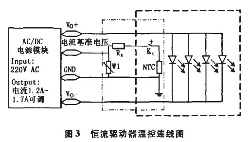 圖3為恒流電源給LED燈供電控制原理圖。電源的指標(biāo)為:220V AC輸入,電流1.2一1.7A可調(diào),電壓自適應(yīng)(36~39V)。圖3中左側(cè)細(xì)虛線(xiàn)框中部分為控制電路,其中W1為可調(diào)電阻器;NTC為負(fù)溫度系數(shù)熱敏電阻;Kt為常開(kāi)溫度繼電器,其閉合溫度為56℃,自動(dòng)斷開(kāi)溫度為45℃;Rx為匹配電阻。圖3右側(cè)粗虛線(xiàn)框中部分為L(zhǎng)ED模塊部分。溫度繼電器和熱敏電阻安裝在LED模塊上,并與模塊緊密接觸,以便將LED的溫度信息反饋給控制電路。常溫下Kt