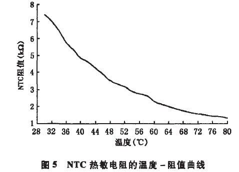 控制電路阻值與輸出總電流的關(guān)系列于表1,其中R為控制電路的等效電阻。經(jīng)過(guò)在恒溫箱中測(cè)試,每2℃記錄1組數(shù)據(jù)得到如圖5所示的NTC熱敏電阻的溫度一阻值曲線(xiàn)。該方案中,驅(qū)動(dòng)電源通過(guò)接收到反饋的溫度信息來(lái)控制輸出電流,根據(jù)圖5中NTC的溫度與阻值的關(guān)系,只要找到輸出電流隨總阻值的變化關(guān)系(如圖6所示),再進(jìn)行適當(dāng)?shù)碾娮杵ヅ洌憧烧业綔囟扰c驅(qū)動(dòng)器輸出電流的關(guān)系。