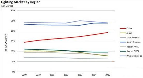 經(jīng)濟(jì)發(fā)達(dá)地區(qū)比如北美和歐洲將會(huì)是照明市場(chǎng)增長(zhǎng)的主要區(qū)域,將會(huì)占到50%左右的市場(chǎng)份額($US)。2010年,中國(guó)占到全球照明市場(chǎng)的14%,2015年預(yù)計(jì)會(huì)增至20%。持續(xù)的經(jīng)濟(jì)增長(zhǎng),建設(shè)熱潮,對(duì)于電力消耗增大的擔(dān)憂以及公眾購(gòu)買(mǎi)能力的提升會(huì)影響該區(qū)域的市場(chǎng)。