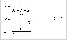 CIE XYZ 1931色度系統(tǒng)中的色坐標x, y, z與三刺激值XYZ之間的關系式如下:
