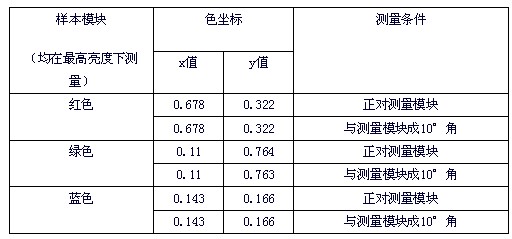 由表1可見,即使人為的偏離基準(zhǔn)測量位置達(dá)10°角,測得的色坐標(biāo)數(shù)據(jù)也沒有明顯變化,因此,除去儀器本身固有的精度等原因帶來的測量誤差,由人對儀器進(jìn)行操作帶來的測量誤差也基本可以忽略。