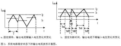 從電感的計(jì)算公式可以看出這兩者之間的差異性,圖1a中的電感計(jì)算式為L(zhǎng) = (Vin–Vo) * Ton /ΔI ,圖1b中的電感計(jì)算式為L(zhǎng)=Vo*Toff/ΔI。Io=Ip-ΔI /2。如圖2所示電流波形示意圖,電感確定后,圖2a中輸入電壓Vin變化導(dǎo)致紋波電流ΔI變化,以致輸出電流變化;圖2b中的紋波電流ΔI與輸入電源電壓無(wú)關(guān)。因此在電壓波動(dòng)較大的寬電壓應(yīng)用環(huán)境下,使用恒定關(guān)斷時(shí)間電路方式。