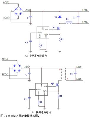 作為一種新型的節(jié)能、環(huán)保的綠色光源產(chǎn)品,LED擁有廣闊的市場(chǎng)前景。市場(chǎng)現(xiàn)階段已經(jīng)出現(xiàn)上千款LED驅(qū)動(dòng)IC。其中我們遇到比較多的是單芯片線(xiàn)路結(jié)構(gòu)(圖1a)。