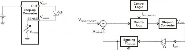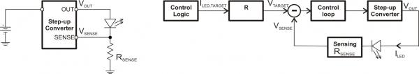 將閃光燈LED 與一個(gè)電流檢測(cè)電阻串聯(lián),然后通過(guò)一個(gè)升壓轉(zhuǎn)換器來(lái)驅(qū)動(dòng),這是一種簡(jiǎn)單的方法。圖1 描述了這種方法。