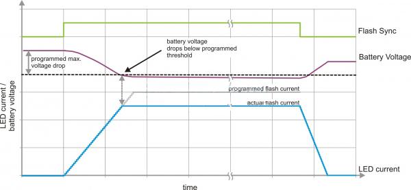 如果閃光燈驅(qū)動(dòng)器本身能夠防止電池電壓下降過(guò)多,那么就可以保持較小的安全界限。通過(guò)使用一個(gè)受控轉(zhuǎn)換率升高LED 電流,并在上升期間持續(xù)監(jiān)控電池電壓可以實(shí)現(xiàn)這一目標(biāo)。