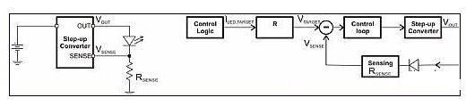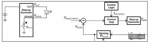將閃光燈 LED 與一個(gè)電流檢測(cè)電阻串聯(lián),然后通過一個(gè)升壓轉(zhuǎn)換器來驅(qū)動(dòng),這是一種簡(jiǎn)單的方法。圖 1 描述了這種方法。