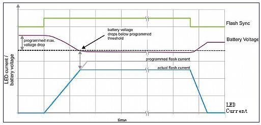 如果閃光燈驅(qū)動(dòng)器本身能夠防止電池電壓下降過多,那么就可以保持較小的安全界限。通過使用一個(gè)受控轉(zhuǎn)換率升高 LED 電流,并在上升期間持續(xù)監(jiān)控電池電壓可以實(shí)現(xiàn)這一目標(biāo)。