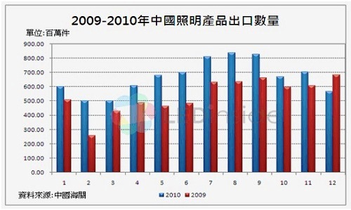 集邦科技旗下研究部門 LEDinside 研究指出,中國目前已成為照明燈具產(chǎn)品的制造大國,將近70%的照明產(chǎn)品都是由中國地區(qū)所生產(chǎn),以白熾燈來說更是如此。LEDinside調(diào)查指出,2010年白熾燈、鹵鎢燈、(緊湊型熱陰極)螢光燈與其他燈具的每月平均出口數(shù)量達6.67億件,金額達11.40億美元;總計2010年出口數(shù)量達79.9億件且金額達136.77億美元,相較於2009年,數(shù)量成長24.2%,且金額成長34.7%。