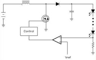 圖中顯示了一個基本的電感升壓電路,其中控制器(Control)給出了一個PWM開關(guān)信號來控制大功率開關(guān)管,后者在導(dǎo)通時對電感充電,而在斷開時電感中的能量就對電容充電。經(jīng)過幾次開關(guān)以后就可以把輸入電壓泵至更高的電壓,從而完成升壓的任務(wù)。改變PWM信號的工作比就可以改變其輸出電壓。為了保持輸出電流的恒定,就要求測量輸出電流值,這是靠一個和LED串聯(lián)的小電阻來測量的。這個電阻上的電壓就和一個參考電壓相比較,比較所得出的誤差信號就送去控制器用以改變PWM信號的工作比,這樣就實現(xiàn)了一個閉環(huán)自動控制,以控制其輸出電流為恒定。