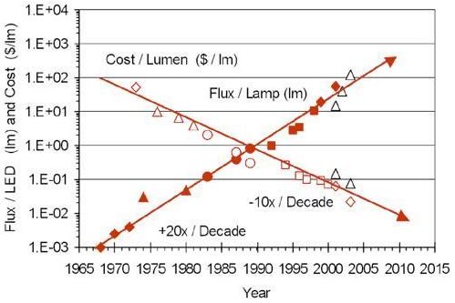 依據(jù)過去30年LED發(fā)展觀察,Lumileds Lighting公司的Roland Haitz先生于2003年歸納出LED界的Moore(摩爾)定律—Haitz定律(如圖1所示),說明LED約每18~24個(gè)月可提升一倍的亮度,以此定理推估10年內(nèi)LED亮度可以再提升20倍,而成本將可降90%以達(dá)到可完全取代現(xiàn)有照明技術(shù),因此LED照明于近幾年火熱的被重視與探討。