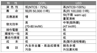 LED因耗電低、不含汞、壽命長、體積小、降低二氧化碳排放量等優(yōu)勢(shì)吸引國內(nèi)、外廠商極力推廣取代現(xiàn)有照明。 LED主要照明可分為顯示背光、車用照明、交通號(hào)志與室內(nèi)室外照明,而背光模組于2009年被廣泛的應(yīng)用于筆記型電腦面板上,此后亦逐漸被使用到家用電視機(jī),其約占了50%之面板模組零組件制造成本與消耗約70%顯示器之電能,故背光照明為顯示面板最重要的關(guān)鍵。 然液晶顯示器無法自行發(fā)光,因此需要背光模組作為光線的來源,所以背光源的好壞會(huì)影響顯示的效果甚劇。 加上面板需薄型化的因素,因此多以CCFL燈管作為背光源,而LED背光源比起CCFL有演色性佳、壽命長、反應(yīng)速度快等優(yōu)勢(shì)(如表1)。